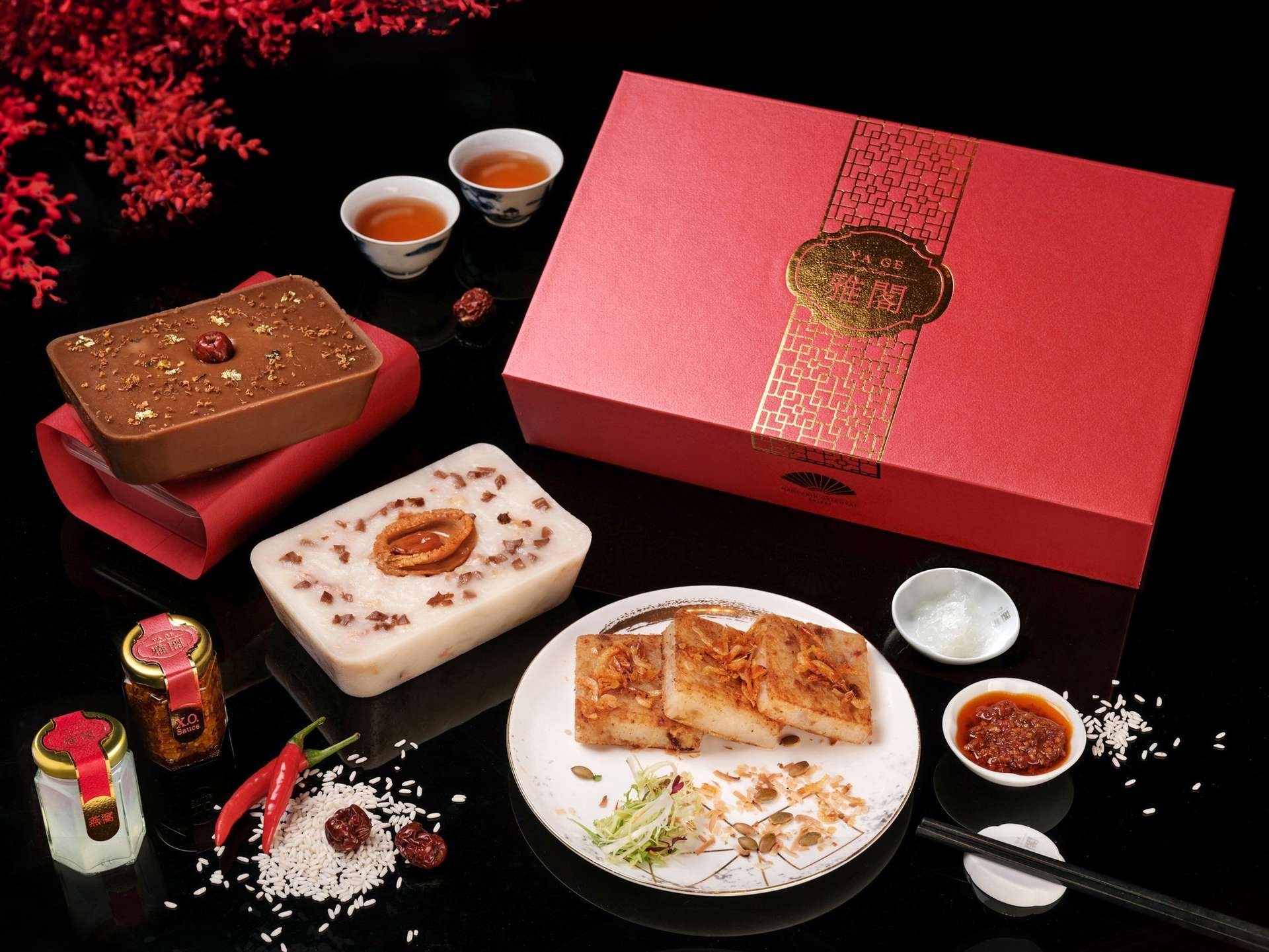 年節限定的豪華應景「手工年糕與燕窩及X.O.醬禮盒」,每盒2,880元,是完全純手工費時製作的極品美味。其中「鮑魚臘味蘿蔔糕」是以傳統港式臘腸、白蘿蔔、蝦米和糯米,搭配頂級鮑魚,以古法手工製出鮮鹹美味。「金箔桂花黑糖年糕」濃郁的黑糖香氣中帶有桂花的優雅清香,甜而不膩的美好滋味讓人難以忘懷,而養顏美容首選的「冰糖燉燕窩」,選用上乘燕窩盞以冰糖燉煮,口感滑順綿密又細緻。此外,亦有雅閣最受歡迎的主廚特製 X.O.醬50ml一入。