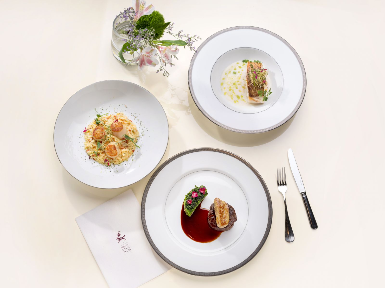 「北海道干貝柚香奶油米型麵」每位2,680元+10%,完美裹覆義式米型麵的醬汁以魚高湯及馬斯卡彭起司為基底,添入柚子汁的芬芳清爽,綴以新鮮柚子皮與檸檬皮,將香煎干貝的鮮美與柚香奶油的清爽結合,帶來輕盈明媚的味覺詩意。「香煎日本真鯛佐法式茴香醬汁」每位2,980元+10%,主廚嚴選日本真鯛,僅單面香煎熟成使魚皮酥脆而肉質柔嫩,以茴香酒、洋蔥與海鮮高湯慢火熬製而成的醬汁入口柔和馨香,於味蕾演繹時令的雅緻風味。「爐烤澳洲和牛羅西尼牛排」每位3,380元+10%,源起自以19世紀音樂家羅西尼命名的經典佳餚 (Tournedos Rossini),亦表徵法式高級餐桌的華麗風格。主廚選用鮮嫩的澳洲和牛菲力,先香煎後爐烤至外脆內軟,於上置以油脂豐潤的香煎鴨肝,輕巧淋以波特酒細火收汁的醇厚醬汁,搭配蘑菇泥及大頭菜的清甜微辛,為週末饗宴奏響於舌尖流轉的華麗樂章。