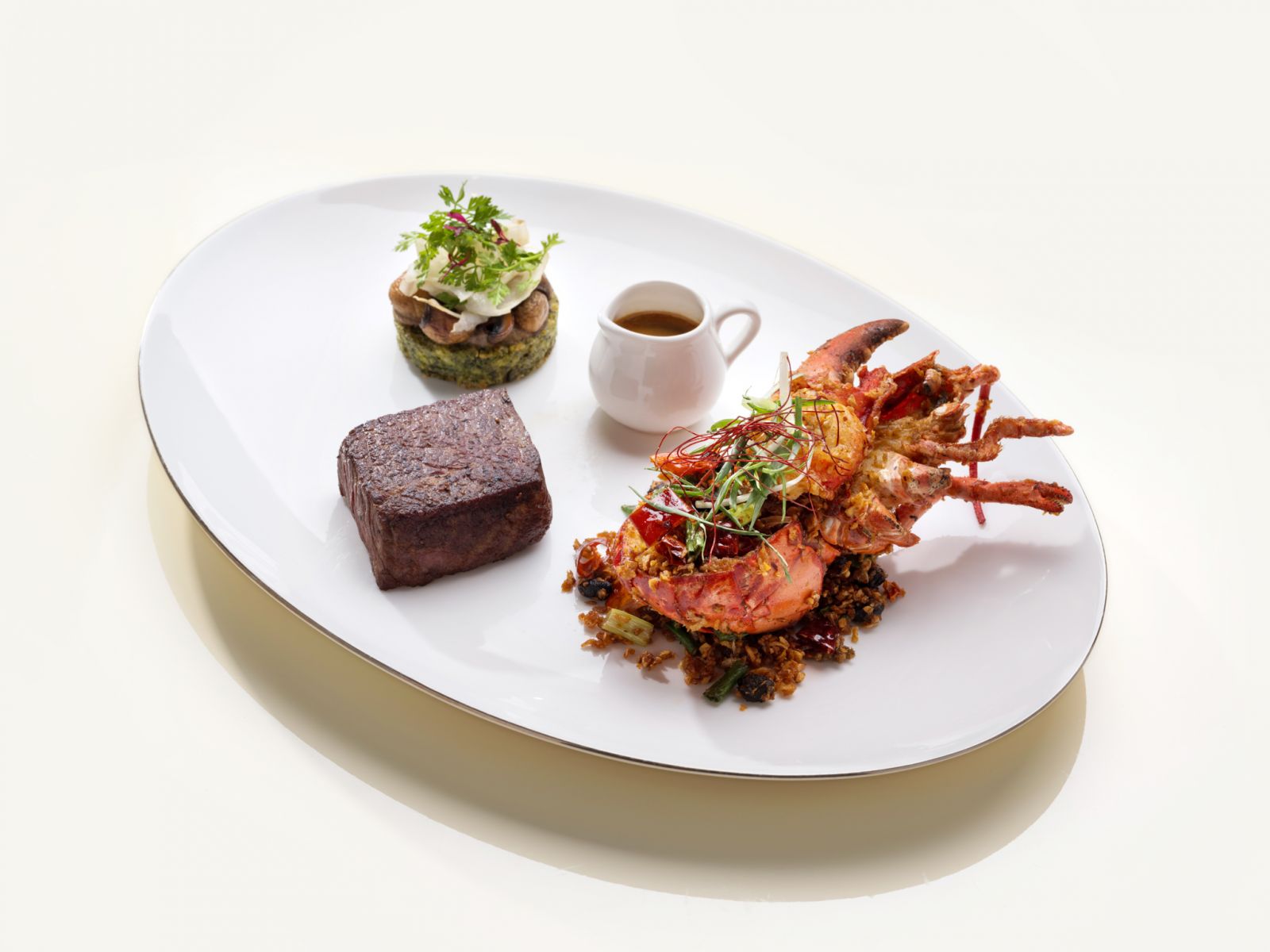 「爐烤日本A3和牛紐約客及避風塘波士頓龍蝦」每位2,280元+10%,嚴選日本A3和牛紐約客,其肉香鮮甜帶有細膩的油花,主廚先煎後爐烤至表層呈現誘人焦香並鎖住肉汁,主廚巧製青花菜蔬餅搭配香煎涼薯片,佐以黑蒜醬汁的辛醇濃潤,襯托和牛肉質的鮮甜;「避風塘波士頓龍蝦」肉質緊實Q彈並帶有鮮甜的海洋香氣,主廚將龍蝦與炸蒜蓉、豆豉、乾辣椒一同大火爆炒,以鑊氣將辛香料完美融入蝦肉中,入口齒頰留香,以海陸珍饈於秋日午后恣饗味蕾的奢華儀式感。