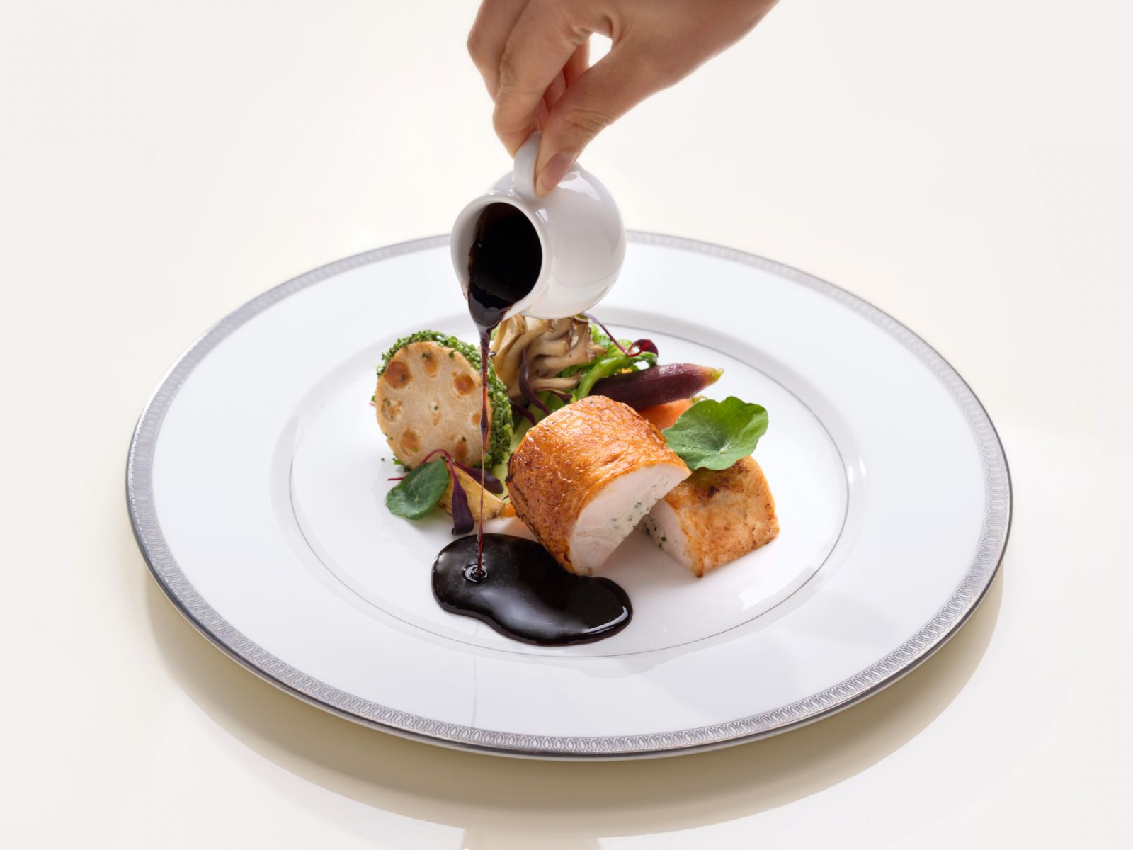 「嫩煎法式雞胸佐松露醬」每位1,580元+10%,主廚將雞胸肉以鹽水醃漬封存鮮嫩多汁,再以低溫烹調40分鐘完美提升肉質的柔嫩度,內裡則巧妙注入白蘭地與鮮奶油製成的細緻雞肉慕斯,將表層香煎後呈現外酥內嫩的誘人滋味,並搭配以酸甜橙汁、丁香及肉桂燉煮後的蘿蔔,襯以蓮藕薄餅的爽脆佐以醇香松露醬,展演季節的風雅香氣。