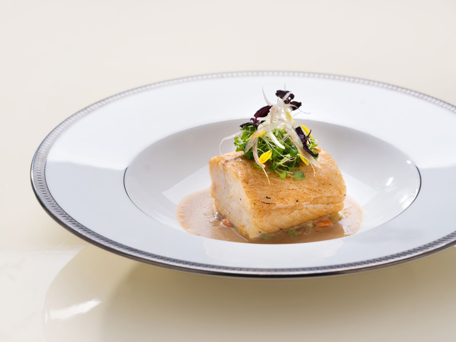 「香煎澳洲莫瑞鱈佐赤味噌醬」每位1,880元+10%,將澳洲莫瑞鱈以香料輕醃舒肥後,香煎至外皮香脆而內裡鮮嫩,醬汁則為此道料理注入日式靈魂,主廚以蛤蜊、魚骨與蝦皮細火慢熬而成湯底,並融合赤味噌增添濃郁醇香,襯托出魚肉的鮮甜,於底部襯以山藥、紅蘿蔔、四季豆等時令根莖蔬材,再綴以茗荷絲帶來清雅尾韻。