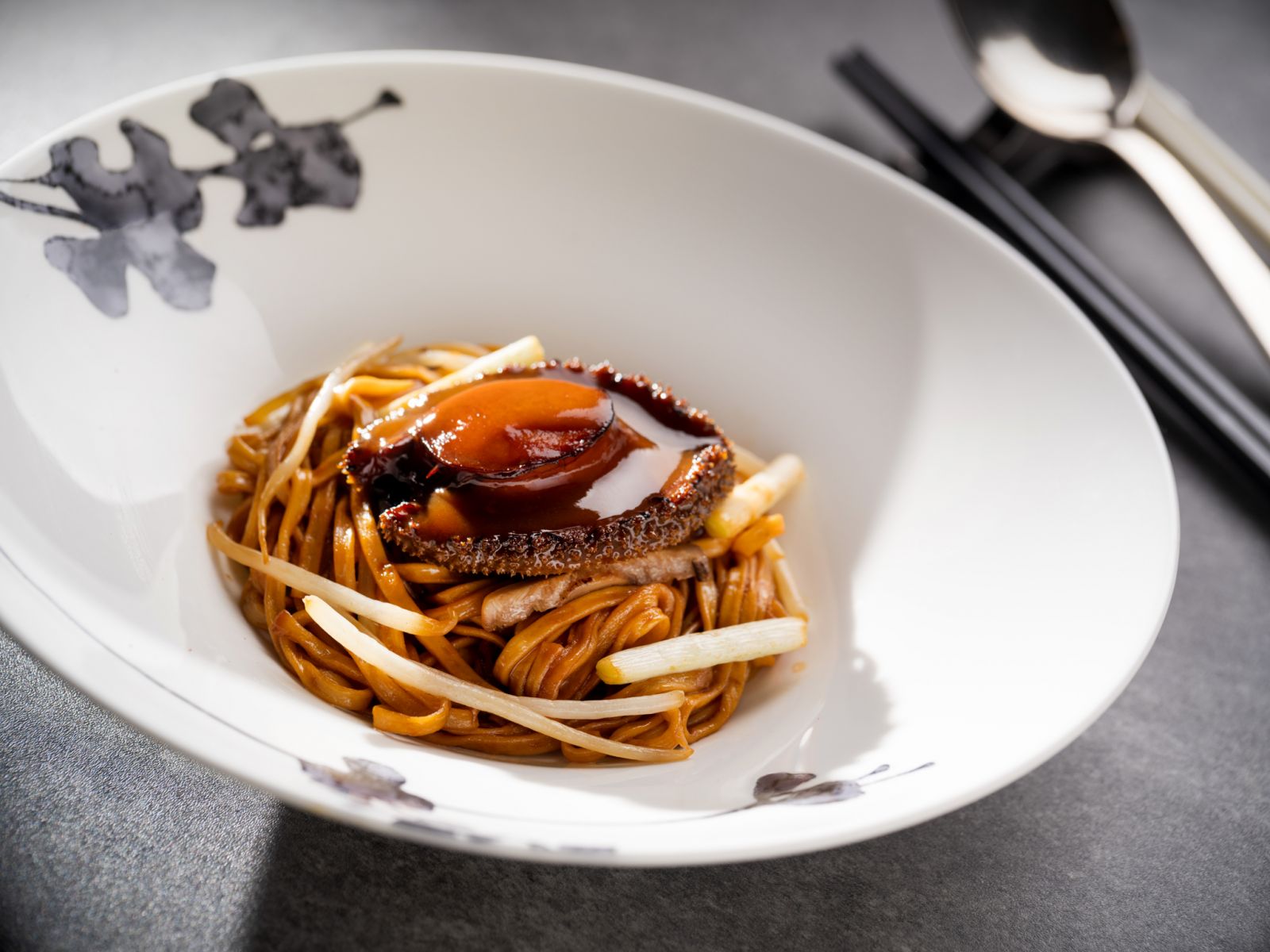 「南非鮑魚燴伊麵」嚴選十頭鮑魚,取老母雞、金華火腿與豬骨熬煮而成鮮醇湯汁,與鮑魚、伊麵一同燴煮入味,麵條柔嫩滑順,鮑魚Q彈飽滿、鮮香四溢,每一口皆是香氣豐盈的交融美味。