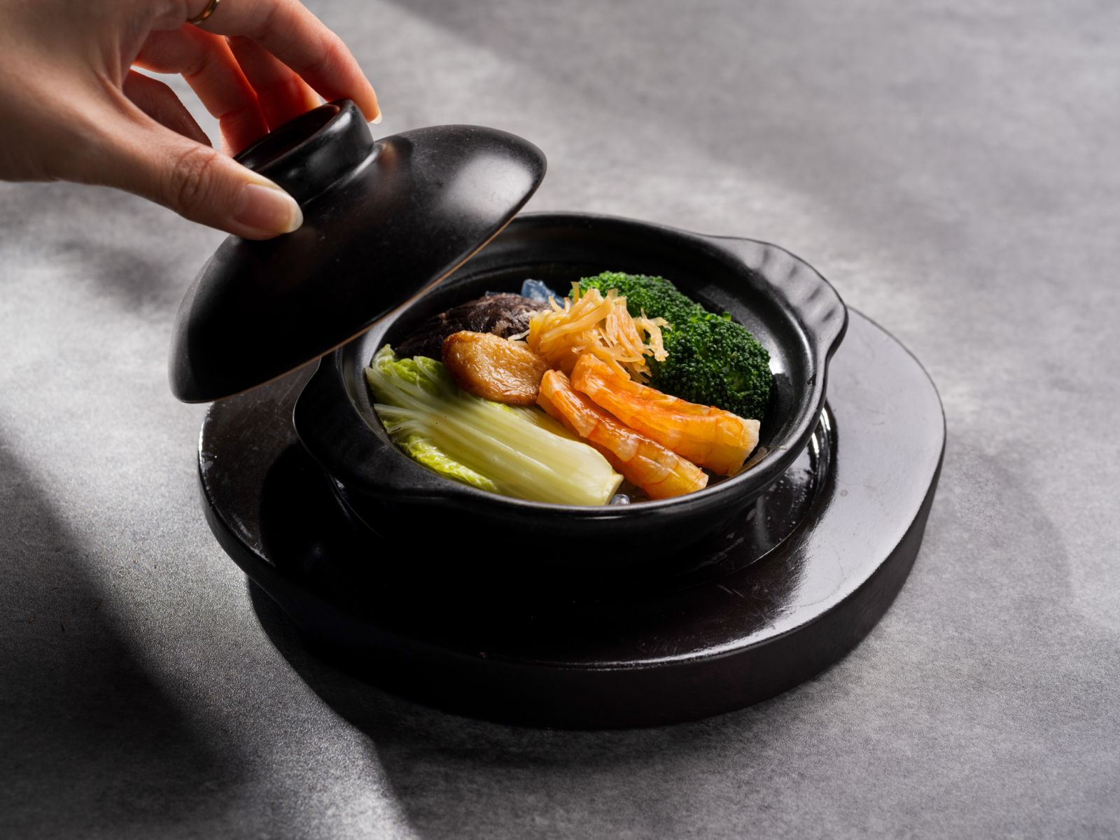 「海珍時蔬粉絲鍋」以蝦乾、瑤柱與香菇燉煮而成湯底,加入時令蔬菜與粉絲燜煮入味,時蔬清脆佐以飽滿吸附鹹鮮海味的粉絲,於味蕾綻放秋香雅緻食感。