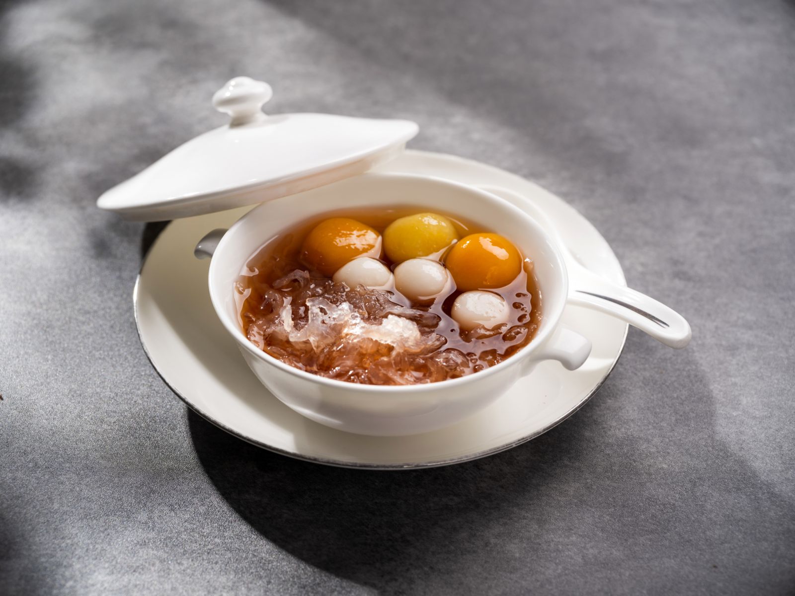 而精緻甜品「薑茶香芋燕窩盅」亦不容錯過,主廚將老薑添以桂花及蔗糖精心熬煮而成薑茶湯底,搭配香芋與手工芝麻湯圓,綴以燕窩的彈潤口感,薑茶辛香入喉溫潤甘甜,伴隨綿柔芋香,於秋意中帶來一份暖心的甜美收尾。