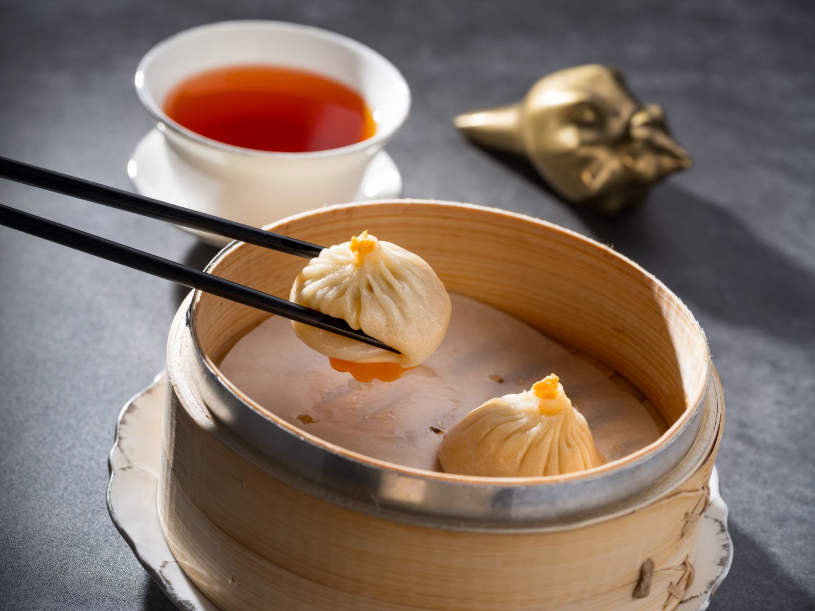 「蟹皇鮮湯包」主廚以大閘蟹肉與蟹黃細火炒香,與豬肉的脂香濃醇完美結合,並包入以金華火腿、老母雞等費時熬製而成的湯凍,蒸透後一口咬下,蟹香與鮮香肉汁浸潤於唇齒間美味繚繞,盡顯秋蟹之極致風味。