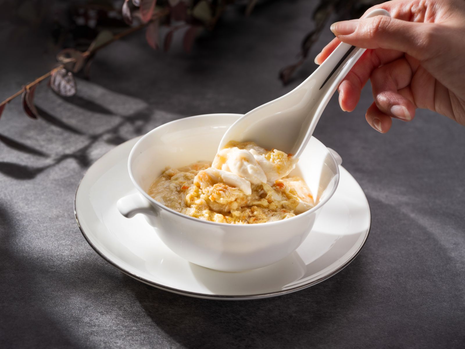 「蟹粉嫩豆花」將大閘蟹肉、蟹黃添以雞高湯,佐以綿細如雪的豆花一同蒸燉,每一匙皆能品嚐到蟹黃的濃郁與蟹肉的甘甜,佐以豆香醇潤,清雅中蘊藏奢華層次,展現粵式細膩火候與秋日柔和氣韻。