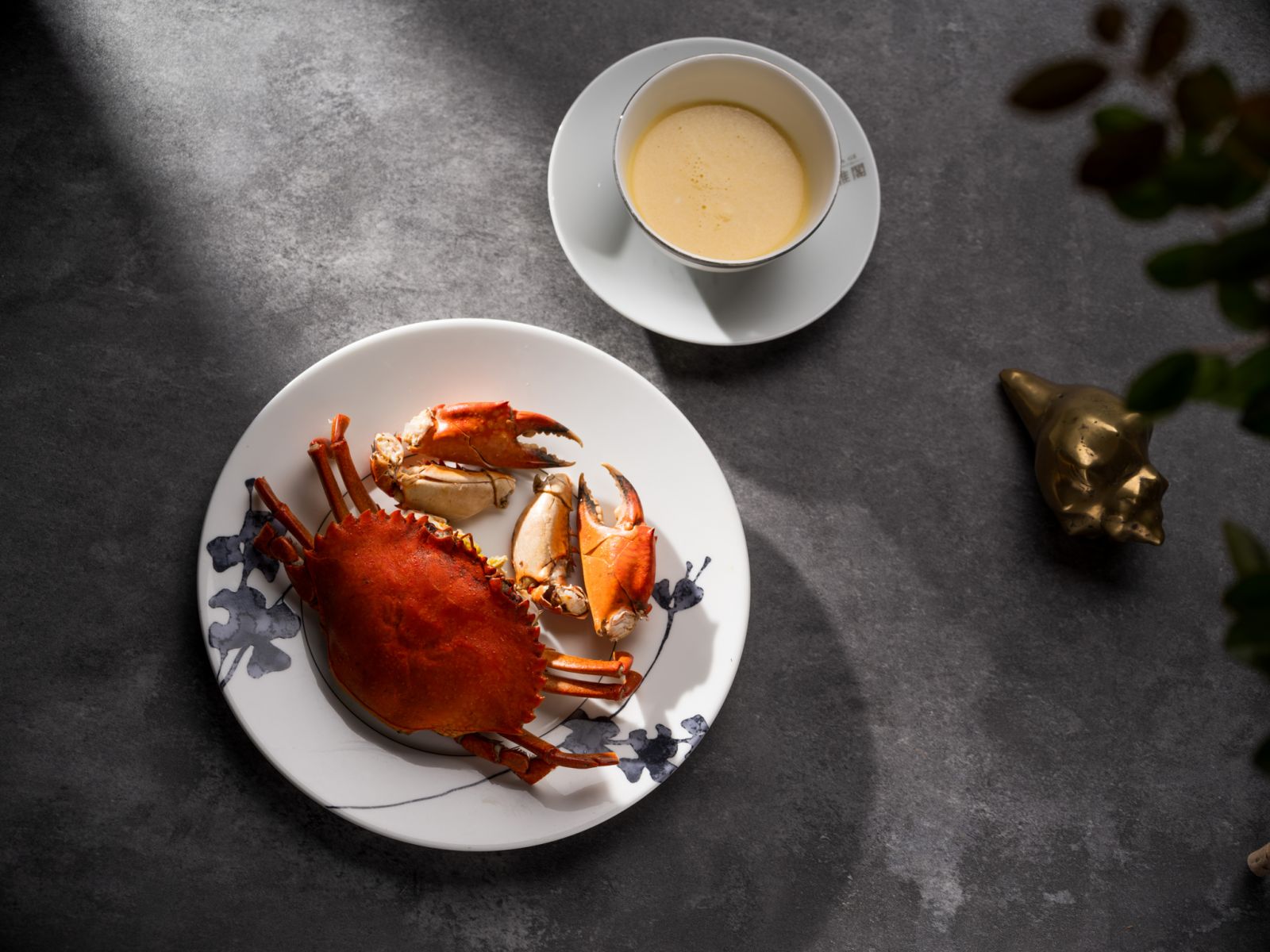 秋日品蟹,大閘蟹重「膏」,而處女蟳重「鮮」。阮明燊主廚嚴選豐腴肥美的優質處女蟳,其特色為肉質細緻飽滿、蟹膏甘甜清香;而大閘蟹的蟹膏濃郁醇厚,帶著油潤豐盈口感。主廚將來自大海的珍饈精心設計「雅閣」秋蟹套餐,除包含有一整隻處女蟳可恣享最純粹的蟹肉鮮美風味,亦特別設計風味獨具的大閘蟹鮮佳餚,將其費時耗工地以手工拆出蟹黃與蟹肉製成的蟹粉入饌,讓食家饕客不必費心自己動手去殼挑肉,也能優雅大快朵頤,享受當令華奢的鮮味。