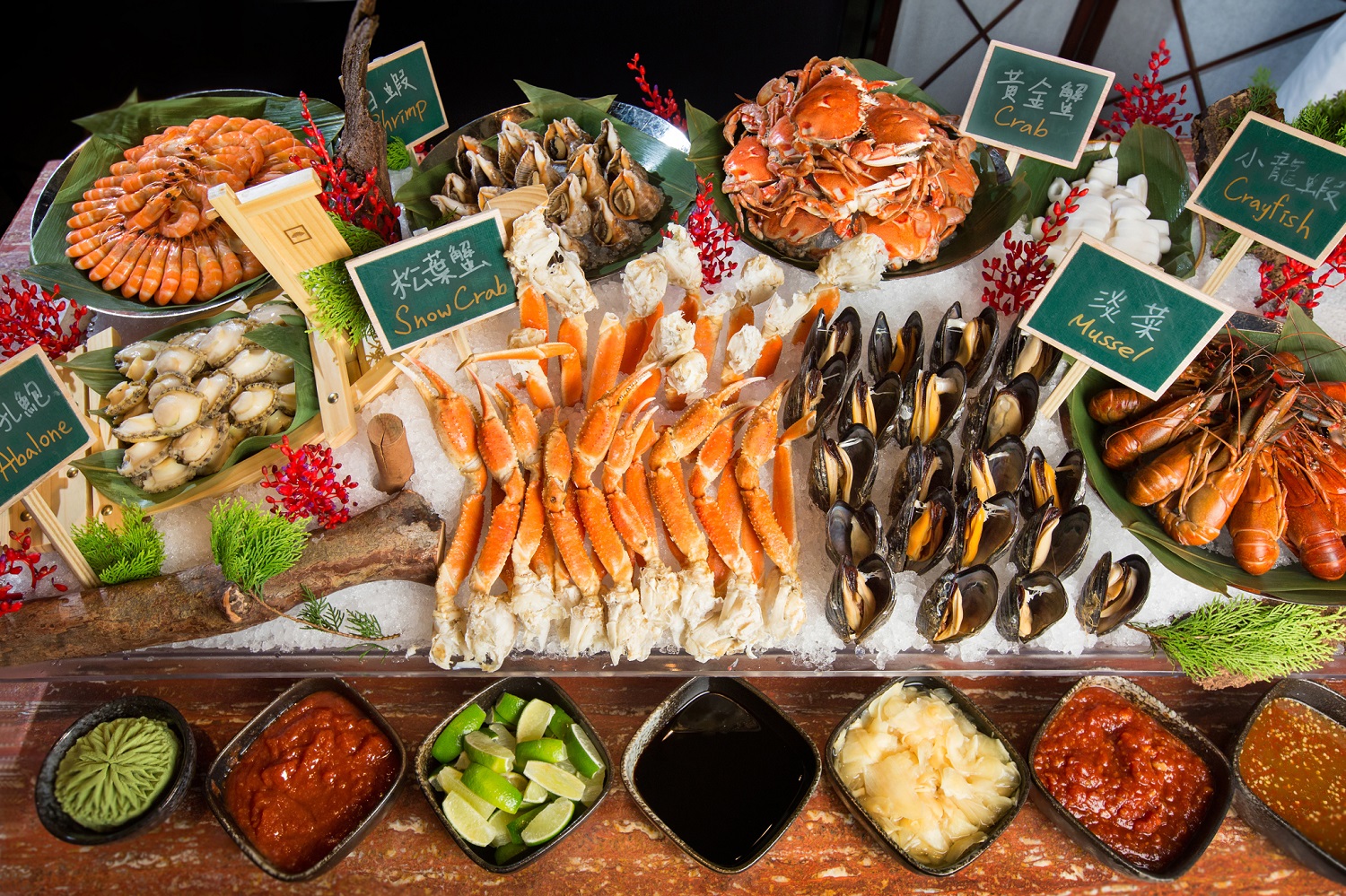 除上述主餐選擇,賓客亦可暢快無限享用多款嚴選季節海鮮,如:帝王蟹、松葉蟹、龍蝦等搭配多種開胃醬料如:紅蔥油醋醬汁、泰式海鮮醬、鷄尾酒醬、五味醬…等,讓海鮮嚐來更加清甜有味。除了暢吃海鮮吧,饕客們還可同時無限享用餐檯上繽紛多元的精緻寰宇開胃佳餚,以及主廚精心料理的美味熱菜,令人食指大動的選項包括:雅閣叉燒皇、京式慢烤櫻桃鴨、燒烤澳洲和牛牛舌、花旗蔘煲雞湯…等。
