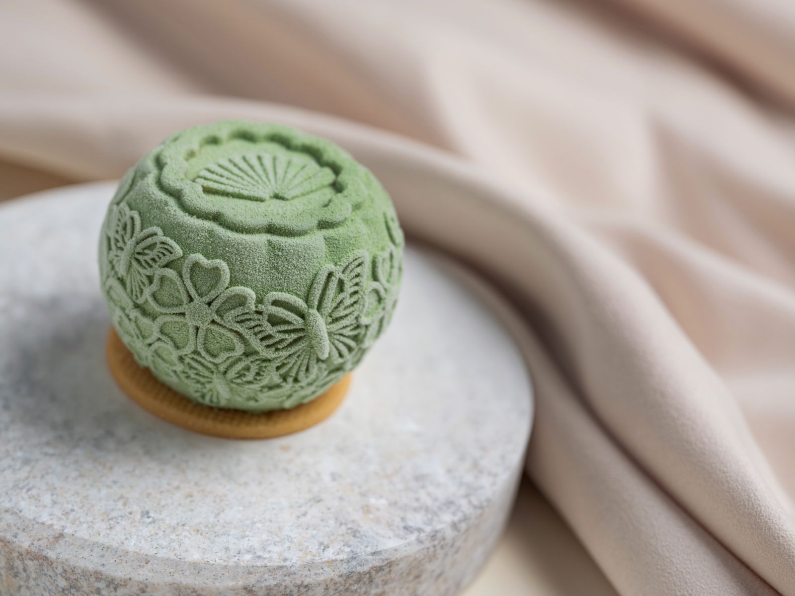 為胡主廚於此次新品中的亮點之作,以台灣紅烏龍茶為靈魂主角,結合蜜桃的香甜多汁,將島嶼風土的芳香蜜韻揉於形若翡翠玉石般的甜品中。主廚選用以傳統製茶工藝的紅烏龍,其特色在於經發酵後所造就的順滑口感與甘果蜜香,搭配法式經典的瑪德蓮注入烘焙烏龍茶的堅果燻香,於喉間縈繞著霧峰山巒的傳承心意。糖煮蜜桃洋溢著果香甜美,綴以鹽味馬斯卡彭奶油的雅致鹹香映襯著悠然茶韻,主廚為外層渲染上青瓷綠並雕琢以蝶舞紛飛的巧緻花紋,以含蓄綻放的美麗織畫文華東方的華美雅韻。