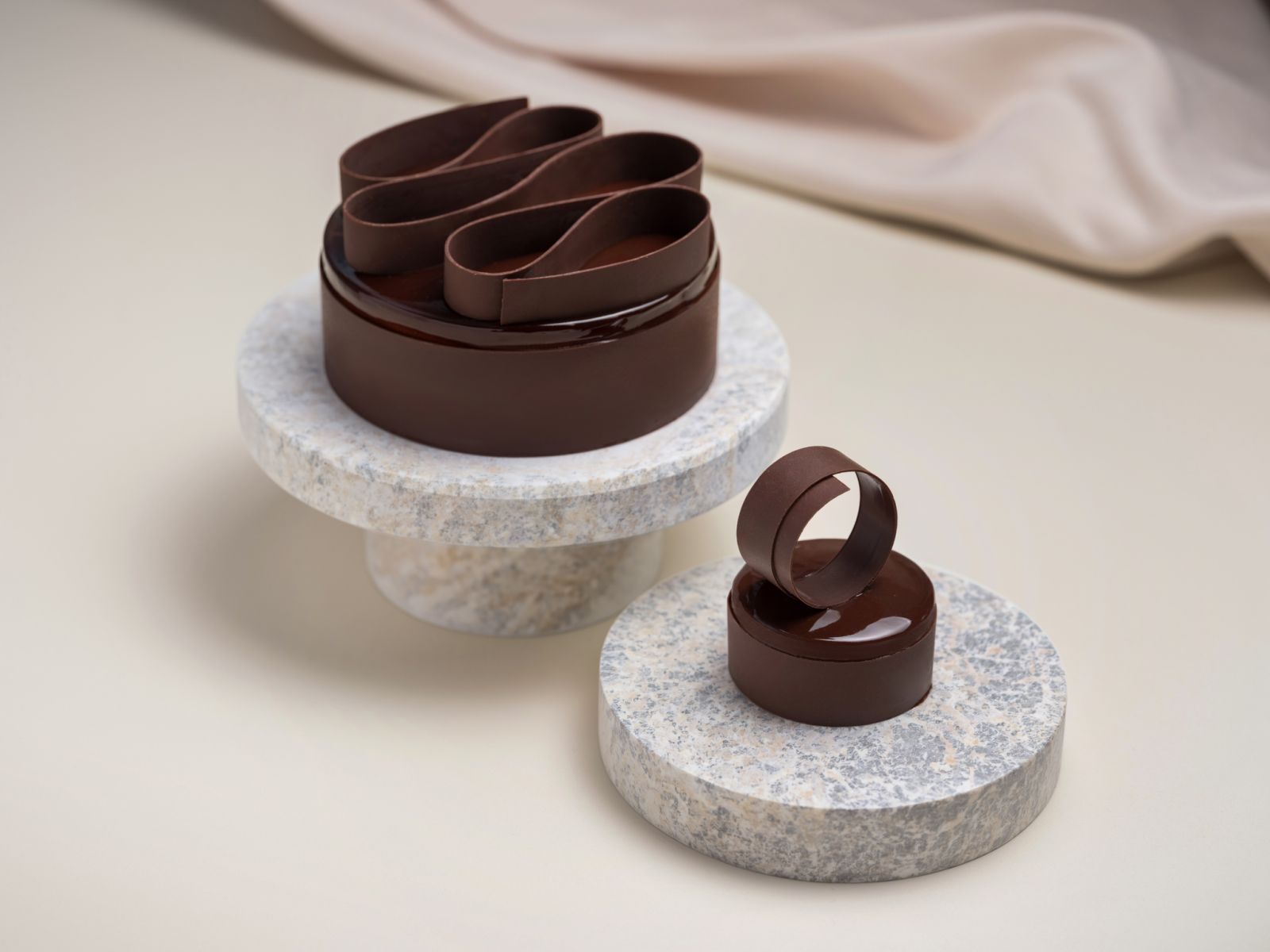 主廚汲取義大利傳統Gianduja風味,為榛果結合巧克力的經典特色,主廚揮灑靈感巧思,以法式甜點工藝賦予新穎的奢華詮釋。苦醇黑巧克力蛋糕為基底,添以榛果巧克力奶霜的優雅香氣,覆上閃耀著琥珀光澤的巧克力鏡面外層,精巧置上極簡摩登的可可皇冠,體驗香醇濃潤的甜美藝術。